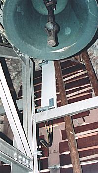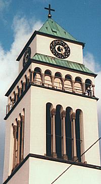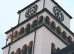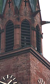 | Etwas offensichtlicher ist der Antennenstandort beim Turm der Kirche in Weingarten/Baden (r) und in Steinfeld/Pfalz (l). Die verwendeten Sektorantennen können durch die Schallfenster hindurch entdeckt werden. Man muss aber schon genau hinsehen. | ![]() |