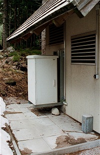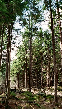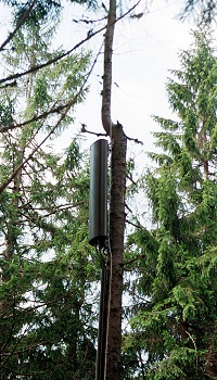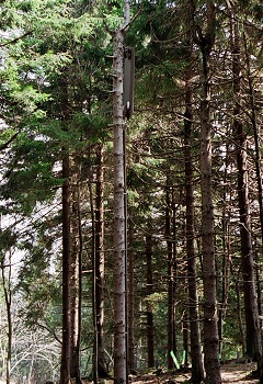 Im Schwarzwald an der B500, beim Mummelsee (ein übler Touristentümpel) findet sich auf einer Höhe von etwa 1.000m üNN eine weitere D1-Zelle die erst kaum zu sehen ist. Beim Näherkommen jedoch entdeckt man Kabel, die aus dem Boden auftauchen und sich an einem Baum in die Höhe winden sowie die Antenne, die sich, farblich angepasst, am oberen Drittel des Baums befindet, der im übrigen noch lebt und munter vor sich hingrünt. |