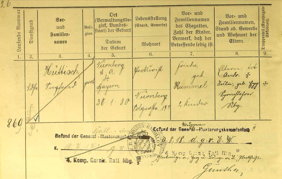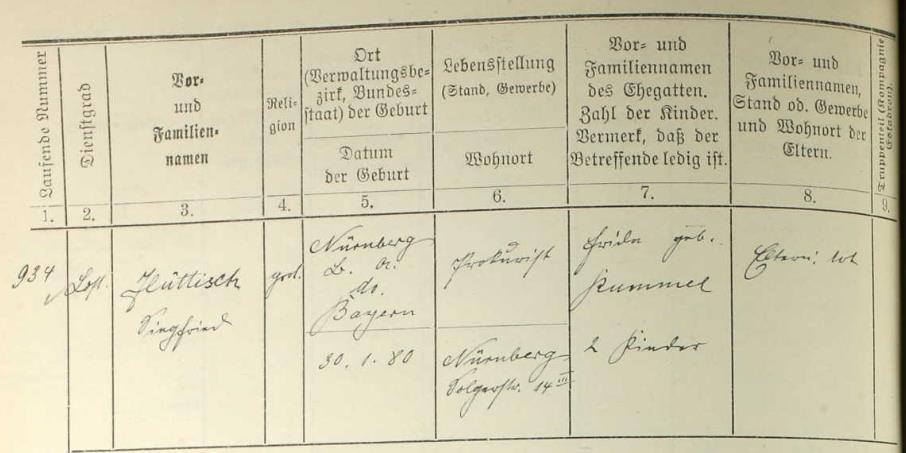 Hüttisch, Siegfried Prokurist, * Nürnberg 30.1.1880wohnte in Nürnberg, Solgerstr. 14 geh.: Frieda Kummel Quellen: ancestry.com, siehe Bild Erstellt mit dem Programm AHNENBLATT (www.ahnenblatt.de).